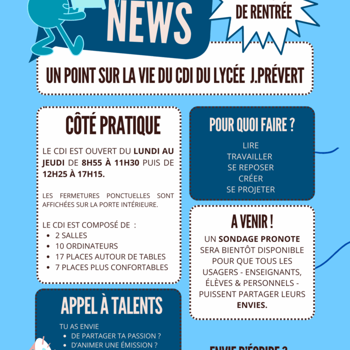 A partir de septembre 2025, Mme PARIS, professeure documentaliste, vous accueille au CDI. prst-CDI_site (pdf) Le Centre de Documentation et d’Information est ouvert du lundiRead More